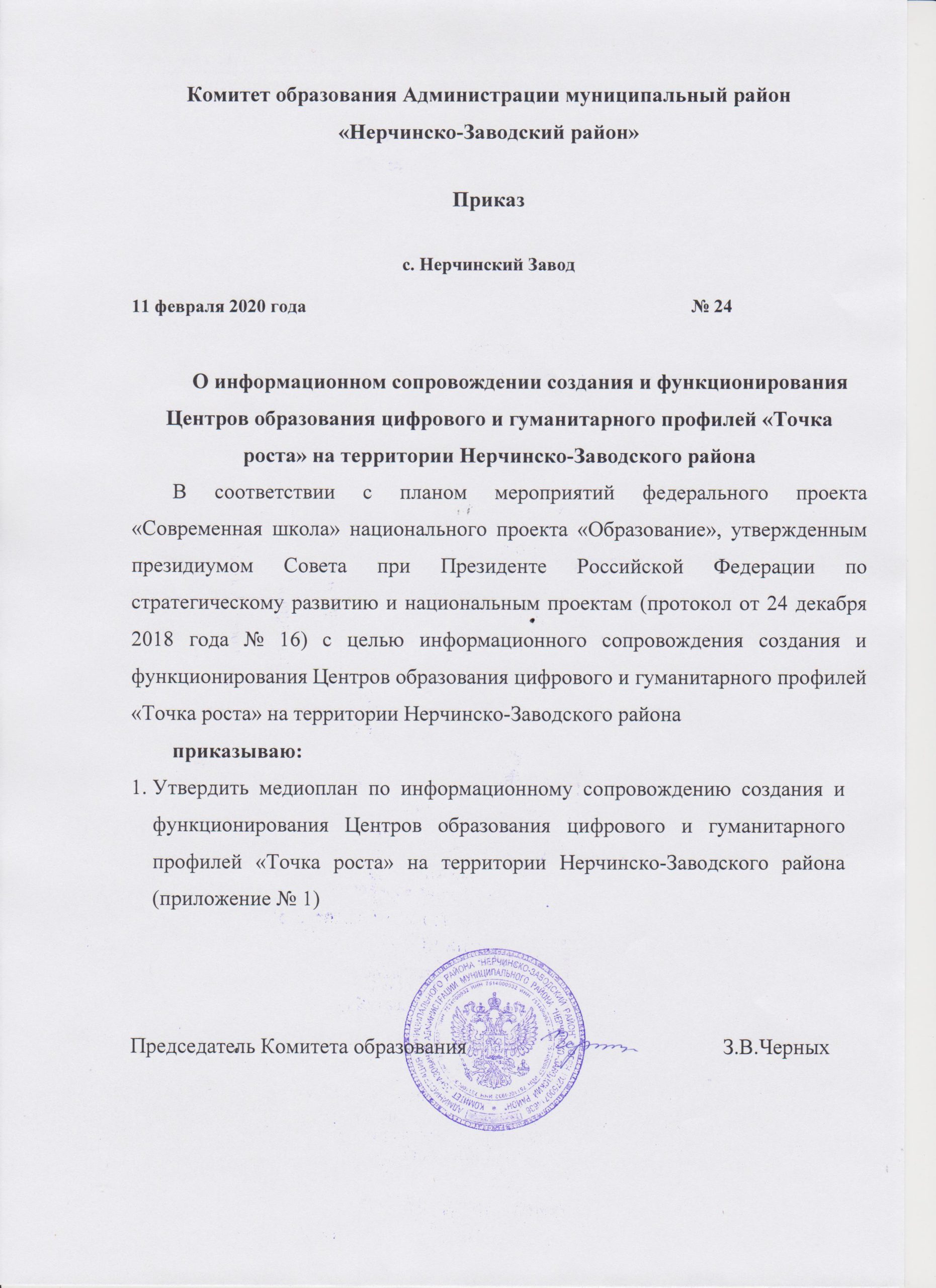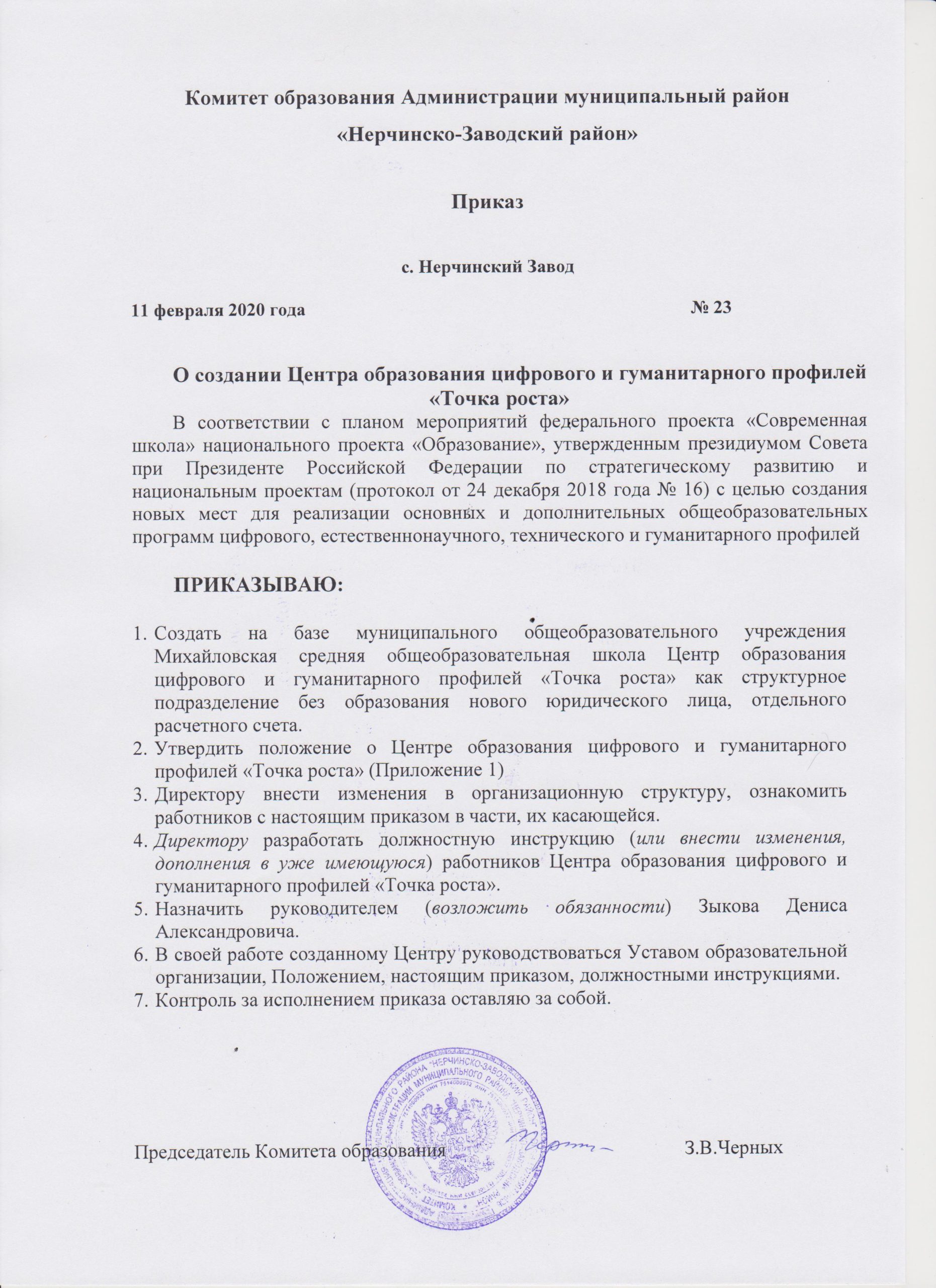 - Приказ Министерства образования и науки Забайкальского края № 280 от 10 апреля 2023 года «Об утверждении минимальных индикаторов и показателей реализации мероприятий по созданию и функционированию в общеобразовательных организациях, расположенных в сельской местности и малых городах, —центров образования естественно-научной и технологической направленностей «Точка роста», создаваемых в 2023 году»